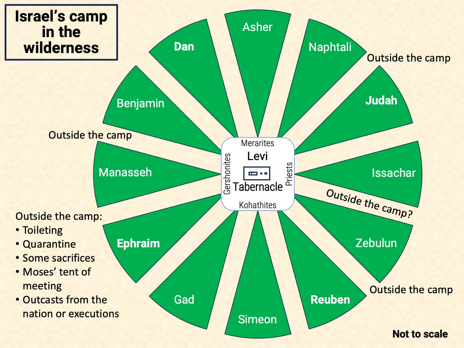 Now if going “outside the camp” meant travelling to the outside of a circular camp, even with the densely packed camp described above, half of the population would have to walk more than 1.4km (1,500 yards) to go to the toilet and retrace their steps to their tent. No doubt this would help to keep the nation fit, but it would be difficult to maintain.