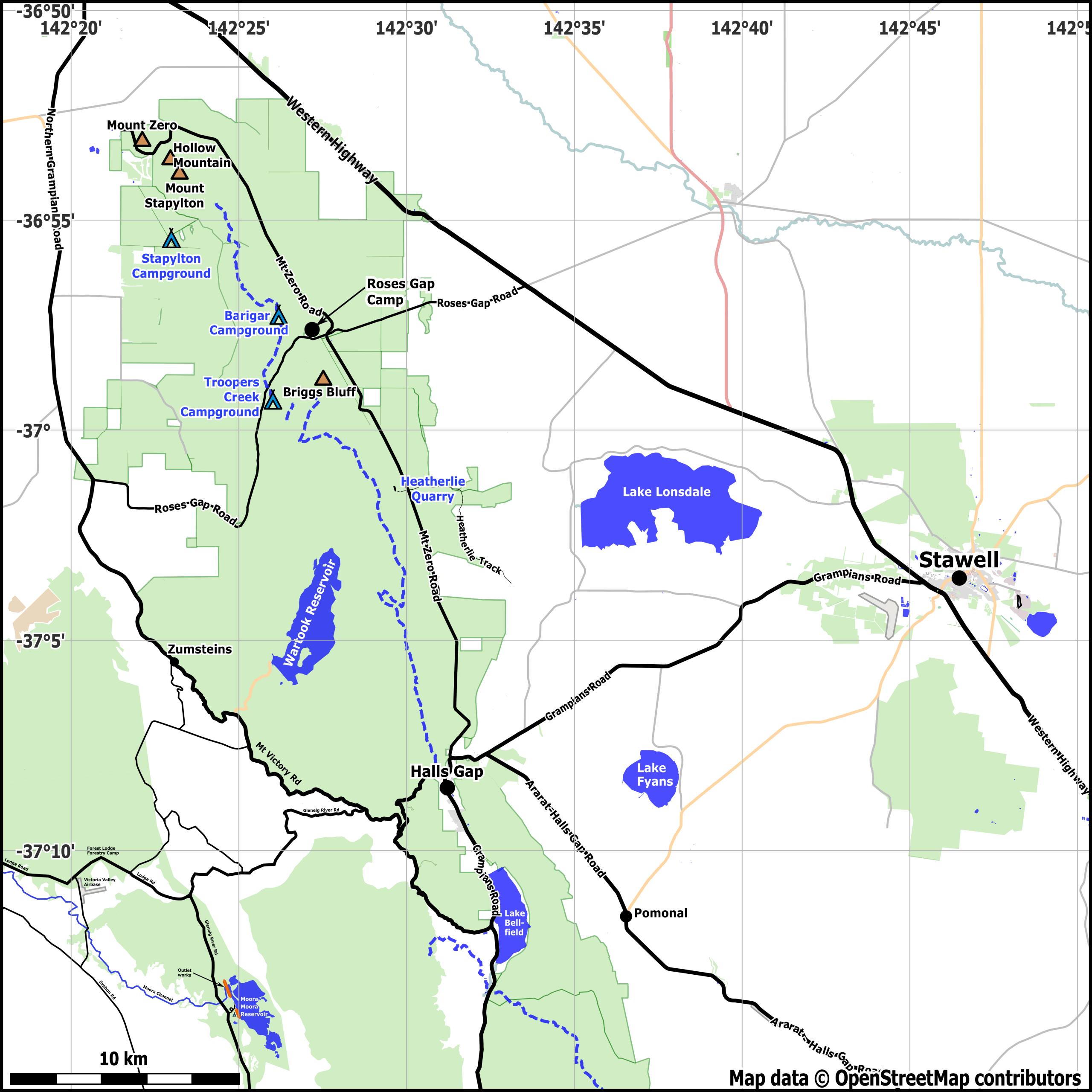 Note that due to bushfires in the Grampians area, access to the Glenelg River Road and Moora Moora Reservoir were restricted from January 2025, but should now be generally accessible again. As of January 2026, Syphon Road is still closed.